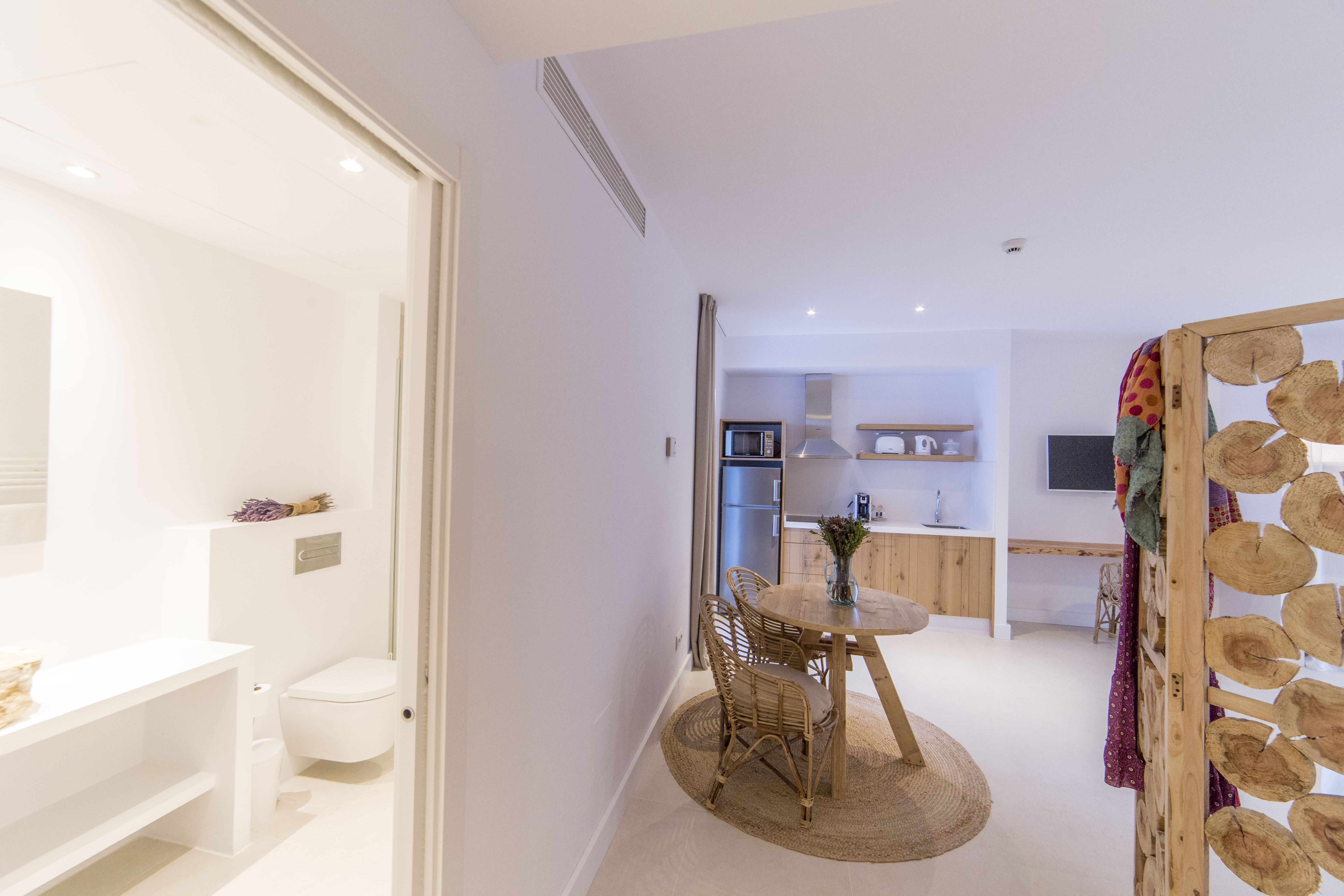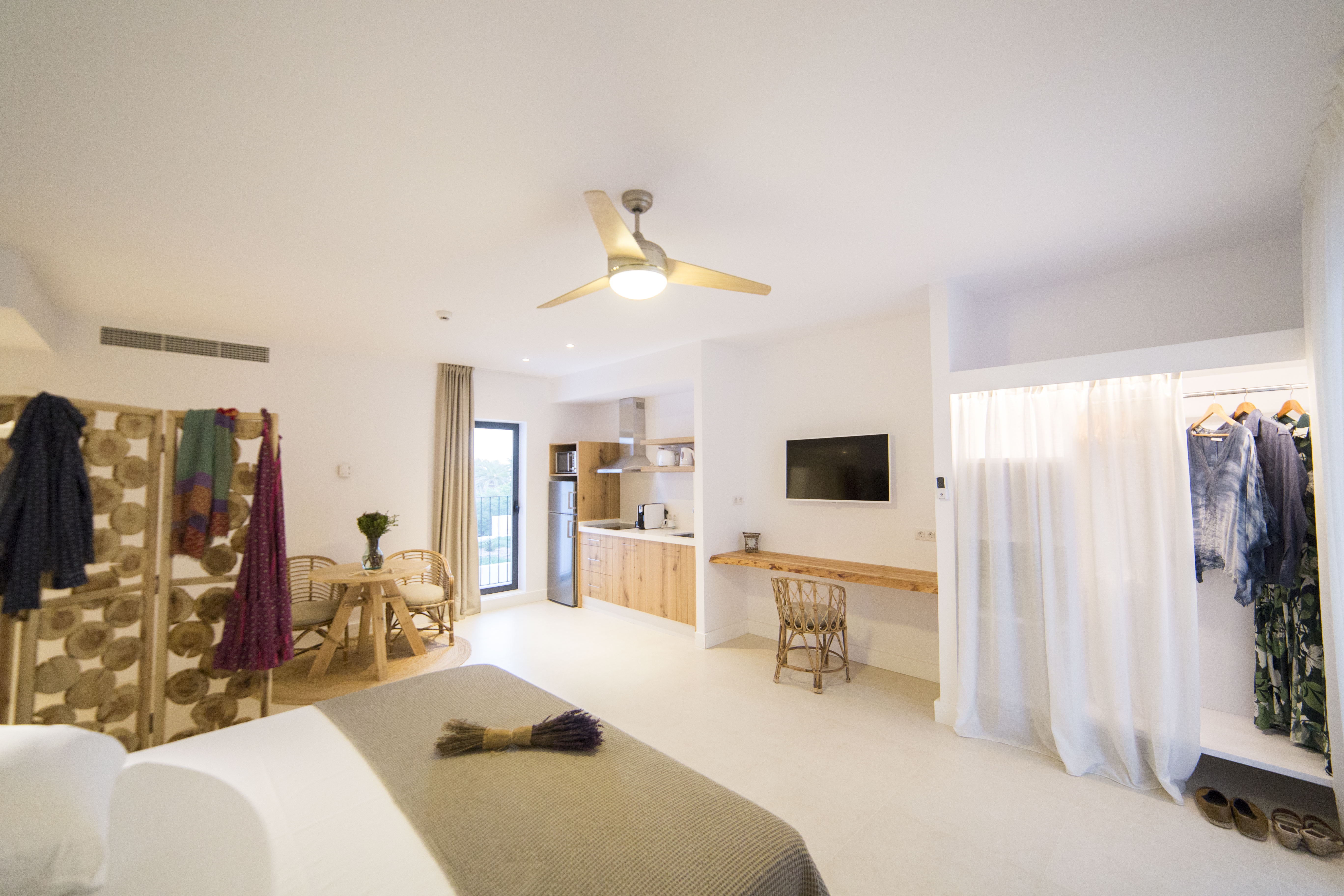 Cuenta con habitación, baño integrado, salón con sofá cama y cocina.